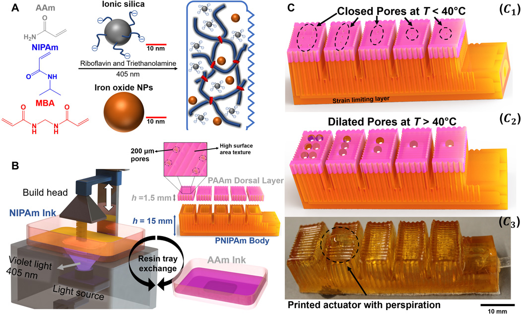 (A) Chemistry of ionic composite hydrogels via photopolymerization of AAm and NIPAm in the presence of sulfonate-modified SiO2 and Fe3O4 using riboflavin photoinitiator, triethanolamine co-initiator, and MBA as a cross-linker. (B) Simplified architecture of the SLA 3D printer with resin replacement mechanism and exploded view of the actuator, which constitutes multimaterial layers; pink color represents the PAAm, brown color constitutes PNIPAm, and h represents the height of PAAm and PNIPAm body. (C) 3D-printed actuator with high surface area and multimaterial design. (C1) Actuator with pore design, texture, and strain-limiting layer. (C2) Animated model showing perspiration. (C3) 3D-printed actuator that resembles the animated model.