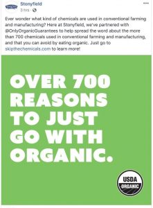 It was then when I started learning about how organic farming actually does use pesticides and started questioning marketing tactics like this, from corporations such as Stonyfield Organic.