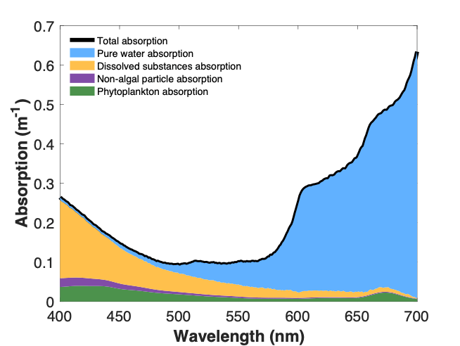 We can study phytoplankton composition by focusing on just phytoplankton absorption. Different plankton species have unique optical signatures driven by their shape, pigments, or taxonomy. By comparing characteristics of the overall phytoplankton optical signature and of the group-specific optical signatures, we can learn about what groups are present in the water.