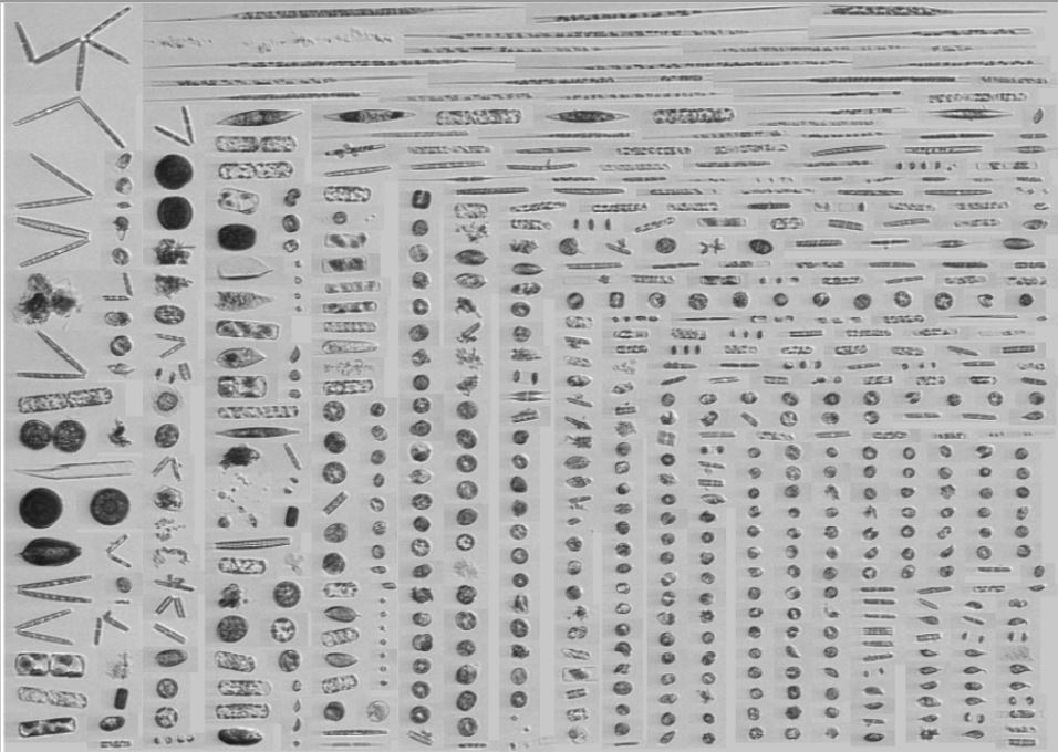 The variety of size and shapes of phytoplankton that might be in a single sample of water (ifcb-data.whoi.edu/timeline?dataset=NESLTER_broadscale).