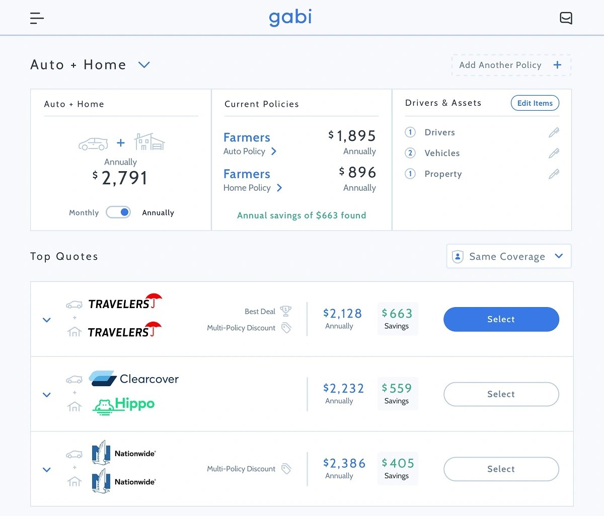 Gabi’s proprietary quoting flow allows customers to connect their existing insurance account or upload a PDF of their policy. It then digitally compares consumers’ existing policies and coverages to quotes from its network of over 40 insurance companies to find the best prices and coverage. The company claims to be the only digital broker in the U.S. that can provide multi-policy options and save customers more money by bundling auto and home insurance in one quote.