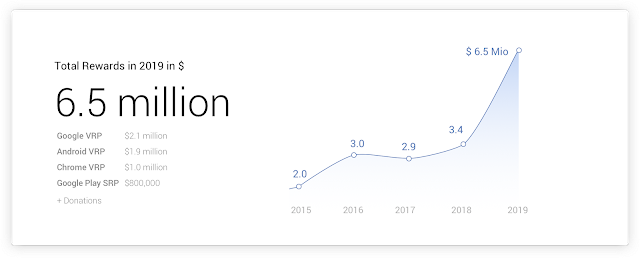 - The Google Play Security Reward Program expanded scope to any app with over 100 million installs, resulting in over $650,000 in rewards in the second half of 2019.