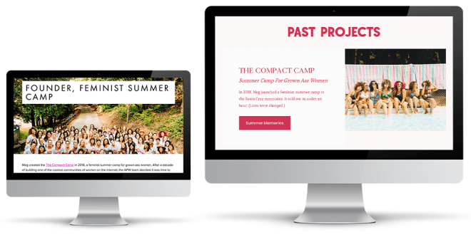 As I started working on this site, I had all of these accomplishments divided into individual pages. But I quickly realized that none of these pages seemed particularly actionable. Yes! I’ve written a book! I run a website! I produced a feminist summer camp! I’m an accomplished art director! That’s all great, and it’s stuff you might want to know about me. But it’s not something you can do a lot with. So having it cluttering up the menu of my website didn’t make a lot of sense to me.