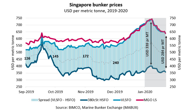 Prices rose in December as shipowners transitioned to the IMO2020 compliant low-sulphur fuel oil causing the VLSFO and High-sulphur fuel oil (HSFO) spread to reach record breaking levels. This trend has started to reserve, with the VLSFO-HSFO spread narrowing in Singapore by USD 55 per MT to 284 per MT on 22 January from USD 339 on 7 January, a 19% decline.
