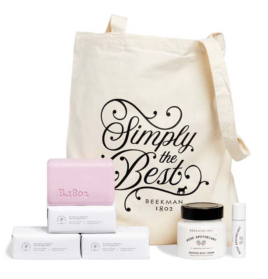 Products include a whipped body cream, goat milk soap, tinted lip balm, and a hand-poured candle. Each item features Rose Apothecary branding, and you can even carry it home in a tote bag printed with the phrase “Simply the Best” (fans of the show can let out a good “aww” right about now).
