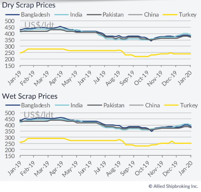 Meanwhile, GMS, the world’s leading cash buyer of ships said this past week that “international uncertainties have seeped through to the recycling markets this week as some dramatic reversals in both sentiments and pricing rocked the industry, leaving Cash Buyers who have bought some expensive tonnage and Ship Owners with fresh vessels to sell, suddenly find themselves chasing down the market. Dry bulk rates have been risible at the start of the year, but that has not yet translated to a deluge of incoming vessels for recycling – perhaps due to a sluggish start with Chinese New Year holidays at the end of January (now extended until February 9 due to the ongoing Coronavirus outbreak) and Ship Owners now waiting to see whether a bounce back would occur upon the conclusion of the holidays.