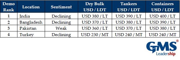 However, this week, we really started to see a plethora of candidates hit the market and this has begun to put further pressure on prices that are already starting to tumble. About 10 Capesize Bulkers and VLOCs are being touted for sale in the coming weeks / months and Bangladesh (traditionally buyers of larger LDT tonnage) will certainly not be able to absorb anywhere near all of this tonnage – given that capable and performing End Buyers with workable bank / L/C limits are already starting to dwindle. Therefore, some of the onus will start to fall on India and Pakistan to lift the burden – albeit at lower numbers that are back below USD 400/LT LDT again and sentiments in these two markets is also starting to creak off the back of failing fundamentals. From the Cash Buyer’s point of view, it may therefore be a case of waiting and watching rather than jumping in on fresh tonnage as rates fall – turning today’s market price deals into tomorrow’s losing ones”, GMS concluded.