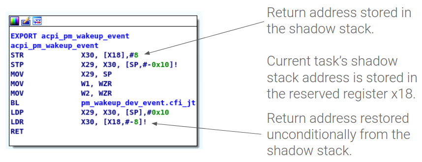 Clang added the Shadow Call Stack instrumentation pass for arm64 in version 7. When enabled, each non-leaf function that pushes the return address to the stack will be instrumented with code that also saves the address to a shadow stack. A pointer to the current task’s shadow stack is always kept in the x18 register, which is reserved for this purpose. Here’s what instrumentation looks like in a typical kernel function: