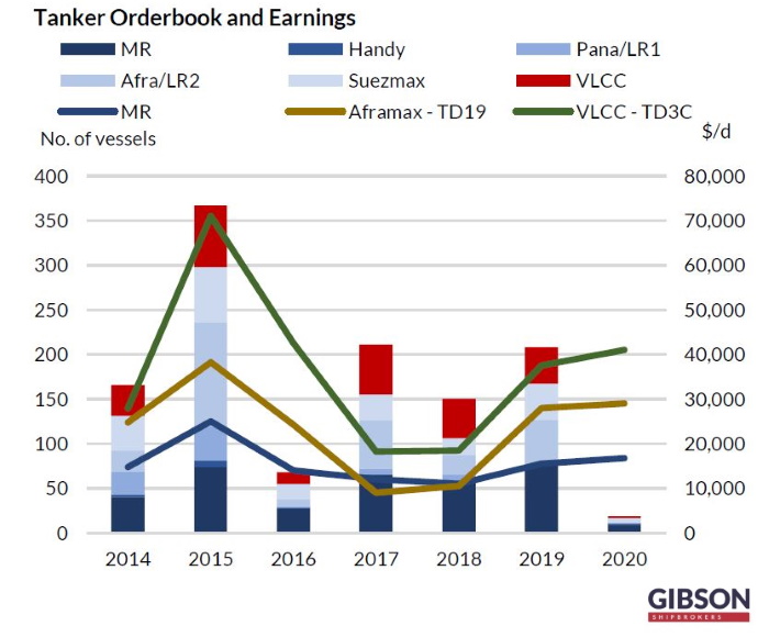 According to Gibson, “the orders poured into South Korea, which remains the dominate player in the newbuilding sector taking 56% of all tanker orders during 2019. Chinese yards received 62 tanker orders, while orders continue to be placed in Japan, albeit at a much lower volume when compared to historic levels, with just 18 tankers. Russia and Vietnam were the only other countries that reported orders for deepsea tankers last year. With the increase in ordering compared to the previous year, there was an up-tick in newbuilding prices with VLCC prices rising by $4 m to $92 m and Suezmax prices rising by $3 m to $62 m. These price rises come at a time when there is uncertainty in the shipbuilding world as various yards in South Korea, China, Japan and Singapore are all considering the benefits of merging. Sinokor ordered the largest number of tankers, with 10 Aframaxes, four MRs and four VLCCs during the year. The Aframaxes will be constructed at Samsung and delivered in 2021. These will be LNG powered and will be chartered to Shell. The VLCCs will be built at Daewoo, whilst the MRs will be constructed at Hyundai Mipo”.