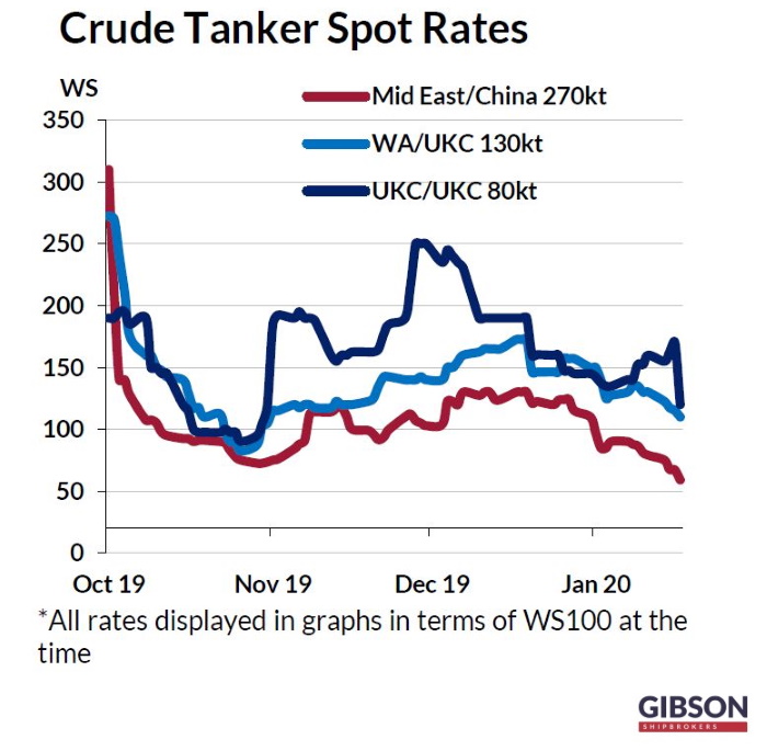 Gibson added that “so, if 2019 was a positive year, what of 2020? The fundamentals for another positive year looked to be in place with a positive reaction to the US-China phase one trade deal, where China agreed to buy $200 billion worth of US goods and services, of which $52 billion in energy purchases. This could re-open the emerging tanker trades between the two countries, with potentially positive impact for the tanker sector. But for the present all crude sectors are already recalibrating sharply lower and there are also some very dark clouds on the horizon for the tanker market. The current situation with the Coronavirus has seen many flights to China discontinued until further notice, could this also happen within the tanker sector? The re-emergence of the COSCO Dalian vessels being could be detrimental to tanker earnings going forward. Also, there is much uncertainty over decarbonisation regulations which seems to be curbing newbuilding orders. The flip side to this could be that the low volume of vessel ordering in 2019 has provided a period of controlled fleet growth, which if continued could bring better fundamentals for tanker earnings”, the shipbroker concluded.
